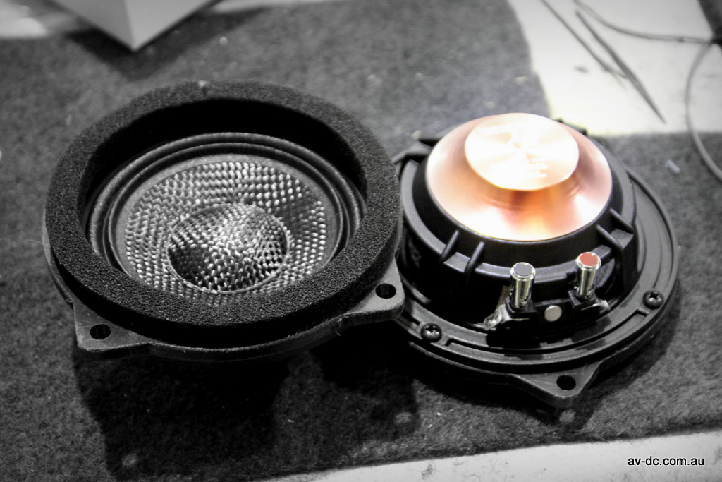 The L4 Pro SE midrange, resplendent in carbon fibre with a copper back plate, oozes build quality and is capable of impressive midrange presence and output. Once again, they're friendly to an OEM installation with a compact double-roll surround and shallow mounting depth. We machined solid HDPE mounts to fit them to the factory door locations.