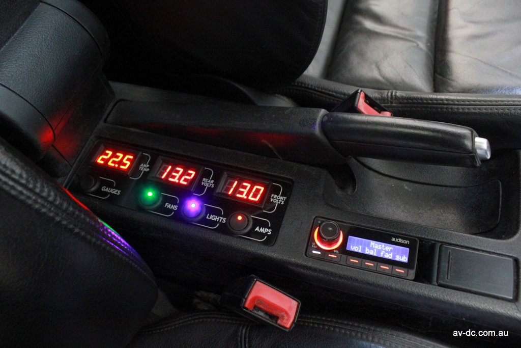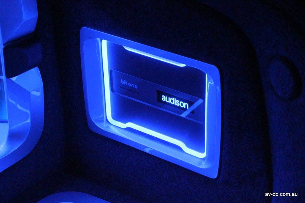 Pioneer's AVH-8850BT touchscreen source unit starts the signal chain, and a bespoke control panel was CNC-machined in-house to monitor and control the system, sitting next to Audison's DRC controller.