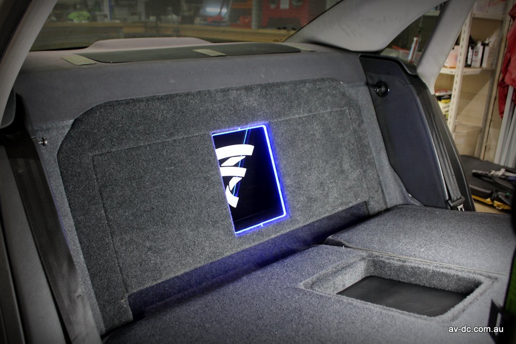 The equipment is framed and presented by a hand-built boot installation, comprising frame pieces finished in colour-matched gloss two-pack paint, dividers trimmed to match the car's interior, and chamfered edge-lit acrylic for a stunning end result full of dimension and contrast, while simultaneously tying each section together visually.