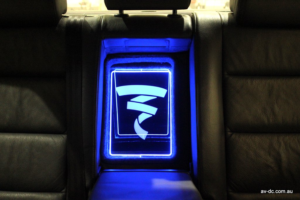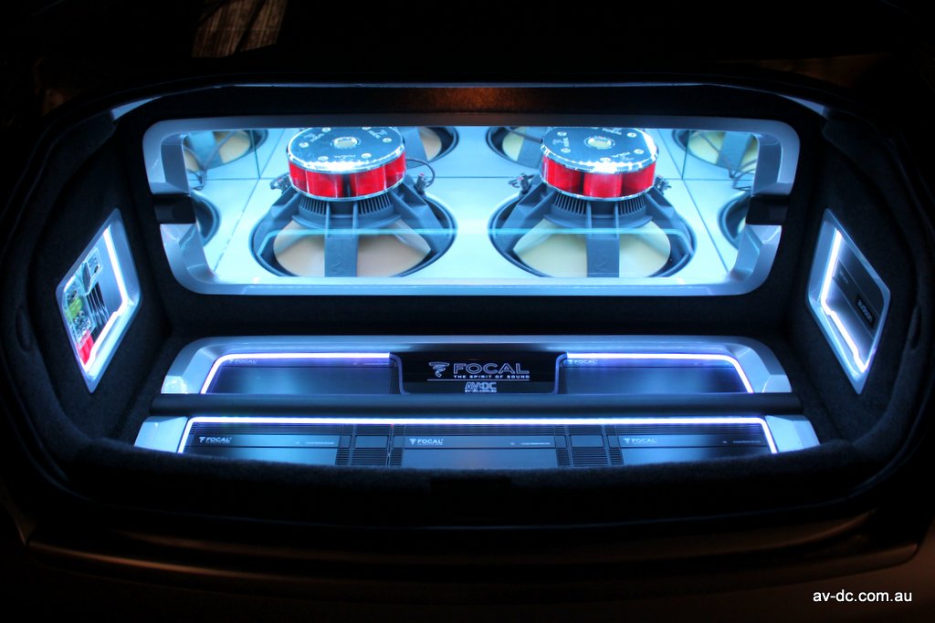 As you can imagine, the boot is the epicentre of such a large build. Taking pride of place are two Focal 40KX 16" subwoofers, presented in a unique down-firing sealed enclosure. The cabin-side of this enclosure is vented through the ski port which we added by removing the leather upholstery, creating an opening in the seat frame, and modifying the trim to fit with an opening when the armrest is down. It's highlighted with an edge-lit clear frame as well as the Focal logo. For maximum output, the rear seat can be folded, with an opening along the bottom edge of the rear seat panel to let the subwoofers play freely into the cabin.