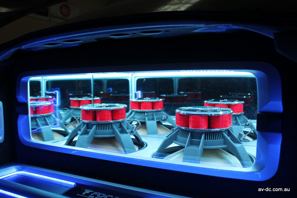 Facing the rear, the inside of the subwoofer enclosure is fully finished in two-pack gloss paint, glass mirrors on three sides, a laminated glass window and colour-changing LED lighting to highlight the beautiful 40KX subwoofers and give the installation a huge sense of space.